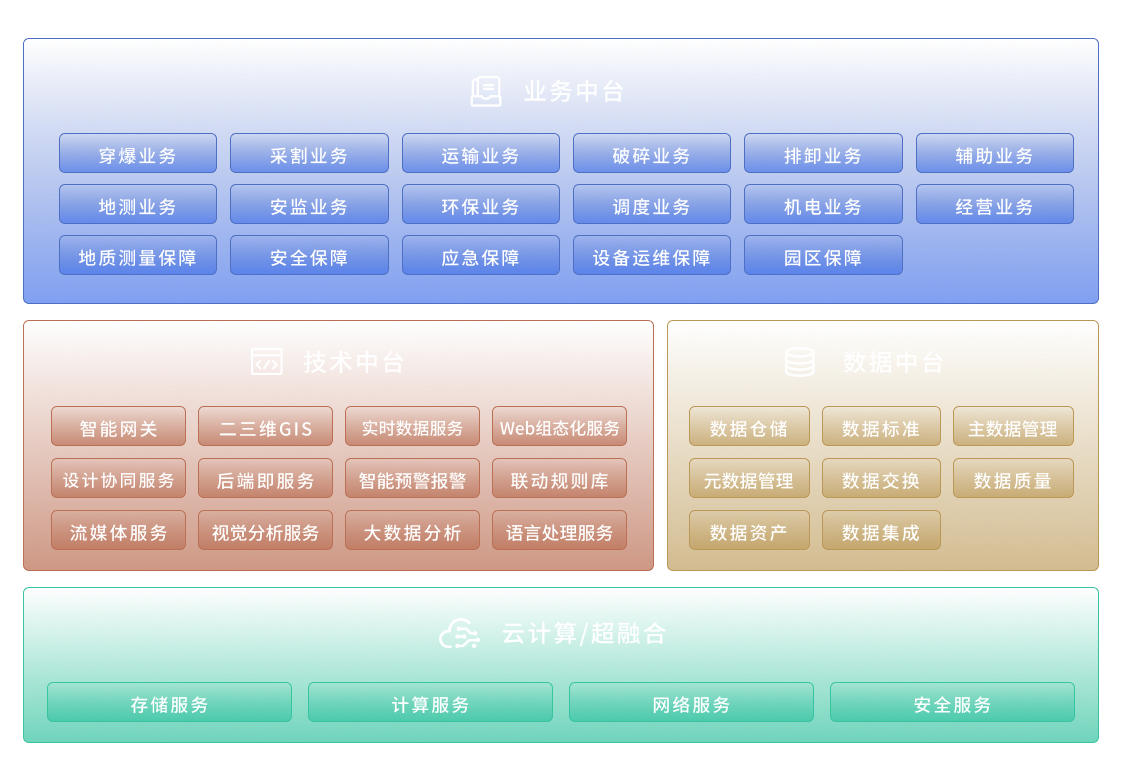 1 набор системы стандартных спецификаций: Система стандартных спецификаций представляет собой коммуникационный мост между физическим миром и виртуальным миром интеллектуальных шахт. Она может эффективно преодолевать информационные «барьеры» между подсистемами и обеспечивать совместное использование данных, системную интеграцию и объединение информации для интеллектуальное строительство угольных шахт. Заложить основу для приложений связи. 1 комплект информационной инфраструктуры: для координирдинации строительства сетевых платформ передачи данных, облачных центров обработки данных и центров диспетчерского управления, чтобы открыть каналы для передачи и использования данных.1 комплект интеллектуальных интегрированных платформ управления и контроля: Интеллектуальное интегрированное управление и контроль — это «мозг» угольных шахт. На основе платформы интеллектуальной операционной системы шахты (RED-MOS) он реализует комплексные данные восприятия «человек-машина-среда» и мульти- объединение данных и интерактивный обмен данными вниз, а также голографическое отображение угольных шахт вверх. Комплексное централизованное управление, диспетчерское управление, управление связями, прогнозирование стихийных бедствий, анализ принятия решений и другие интеллектуальные приложения действительно реализуют интеграция «мониторинга, контроля и управления» угольных шахт. N интеллектуальных подсистем: посредством интеллектуального построения производственных и вспомогательных систем или модернизации и трансформации, а также построения систем позиционирования персонала, интеллектуального индивидуального оборудования, инспекционных роботов и т. д. , на основе различных датчиков, камер, индивидуального оборудования, приборов контроля, интеллектуальных терминалов и другого оборудования, комплексная реализация информации «человек, машина и окружающая среда» на угольных шахтах, чтобы действительно достичь целей сокращения количества людей, снижение затрат и повышение эффективности и безопасности на шахтах.