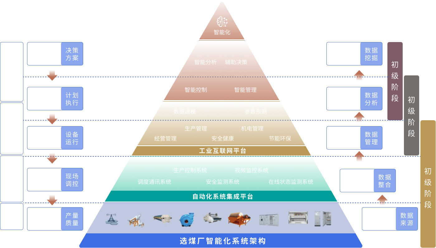 The overall solution of Huaxia Tianxin Intelligent Coal Preparation Plant is based on the Intelligent Mine Operating System Platform (RED-MOS®), which integrates production, operation, safety, operation and maintenance into the intelligent management and control system by means of diversified data acquisition methods, using technologies such as interconnection, Internet of Things, data, cloud computing and intelligence. It realizes the intelligent management and control of basic information management and production process, improve management efficiency, reduce prediction and increase economic benefits, and finally, a safe, efficient, green and comfortable humanized intelligent coal preparation plant will be built. The construction of intelligent coal preparation plant mainly includes infrastructure construction (including plant network, equipment and facilities, basic software), basic automation, intelligent control, intelligent management system, intelligent decision-making, information security, management system and other aspects, each of which includes many subsystems.