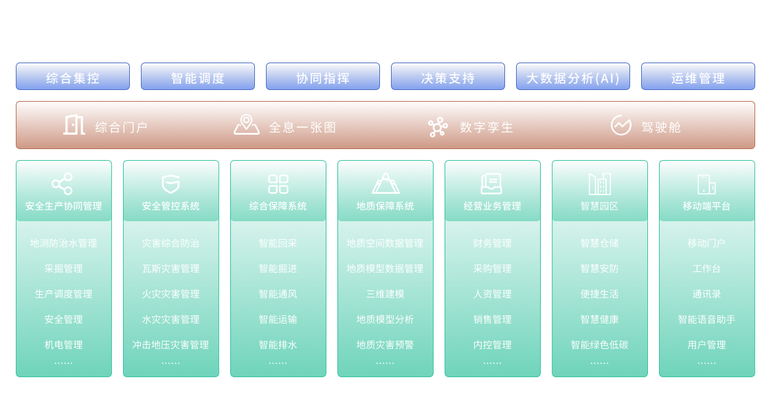 Создание единой интеллектуальной системы управления бизнесом, включая цифровую систему принятия решений, управление жизненным циклом оборудования и другие системы, планирование и контроль затрат, поддержка полного интегрированного использования всех бизнес-приложений угольной шахты, преодоление изолированных островов управления и данных, реализация интеллектуализированного управления бизнесом с принципами "единое управление людьми, финансами и материальными ресурсами", "единое производство и сбыт", "полное взаимодействие бизнеса".